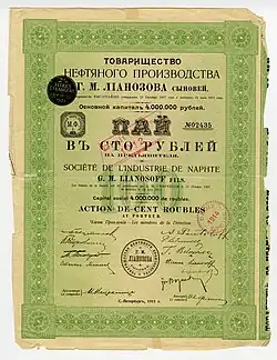 Товарищество нефтяного производства Г. М. Лианозова сыновей наряду с компаниями Бранобель и Бакинское нефтяное общество считалось одним из «трех китов» российской нефтедобывающей промышленности начала XX в[1]. Устав Товарищества нефтяного производства сыновей Г. М. Лианозова был Высочайше утвержден 23 октября 1907 года[2], вскоре после смерти самого Георгия Мартыновича Лианозова — известного российского предпринимателя армянского происхождения, потомственного почётного гражданина, действительного статского советника, купца 1-й гильдии, основателя и председателя «Русского нефтепромышленного общества». За годы своей деятельности вплоть до национализации в начале 20-х гг. товарищество активно приобретало новые участки нефтедобычи на территории Бакинского нефтегазоосного района, наращивало масштабы операций по продаже нефтяных продуктов за границу, увеличивало основной капитал и осуществляло дополнительные эмиссии собственных ценных бумаг.