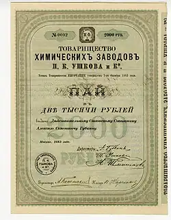 В 1883 г. сын К. Я. Ушкова, Петр Капитонович, считающийся одним из пионеров отечественной химической промышленности, на базе этих предприятий учредил «Товарищество химических заводов П. К. Ушкова и Ко». Компаньоном Петра Ушкова выступил его младший брат Константин Капитонович, впоследствии получивший известность как член Товарищества по учреждению Московского художественного театра и первый пайщик театра.