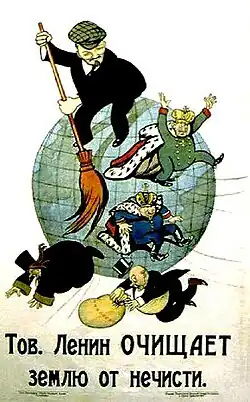 Плакат под названием «Товарищ Ленин очищает землю от нечисти» появился в ноябре 1920 года, к третьей годовщине Октября.[4]
