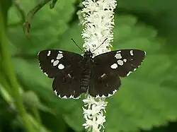 Размах крыльев 31 — 34 мм. Общий фон крыльев чёрный, бахромка — пёстрая. Рисунок на передних крыльях образован крупными полупрозрачными светлыми и белыми пятнами, из которых 1 расположено у вершины центральной ячейки. Более мелкие пятна расположены около верхушки крыла и костального края. Задние крылья с размытым белым дискальным штрихом. Рисунок на нижней стороне крыльев в целом повторяет рисунок на верхней стороне[2][1].