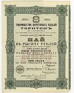 Пай в 1000 руб. Товарищества шерстяных изделий Торнтон в С.-Петербурге. С.-Петербург, 1901 г.[1]