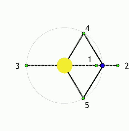Если на основе линии, соединяющей оба тела системы, построить два равносторонних треугольника, две вершины которых соответствуют центрам тел M1 и M2, то точки L4 и L5 будут соответствовать положению третьих вершин этих треугольников, расположенных в плоскости орбиты второго тела в 60 градусах впереди и позади него.