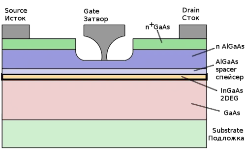 На рисунке представлена структура HEMT-транзистора в разрезе. На полуизолирующей подложке арсенида галлия (GaAs) выращивается нелегированный буферный слой GaAs. На нем наращивается тонкий слой полупроводника с иной шириной запрещенной зоны — InGaAs, такой, что образуется область двумерного электронного газа (2DEG). Сверху слой защищается тонким спейсером на основе арсенида алюминия-галлия AlxGa1−xAs (далее AlGaAs). Выше следуют легированный кремнием слой n-AlGaAs и сильнолегированный слой n+-GaAs под контактными площадками стока и истока. Контакт затвора приближен к области двумерного электронного газа.