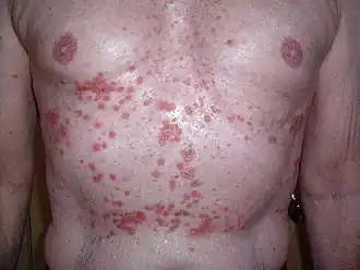 Заболевание проявляется поражением кожи в виде папул красновато-синюшного цвета и мелкими пузырями с прозрачным содержимым диаметром 2–5 мм. Элементы располагаются группами без тенденции к периферическому росту и слиянию. Излюбленная локализация высыпаний: шея, плечи, грудь, спина, бедра. Высыпания сильно зудят.