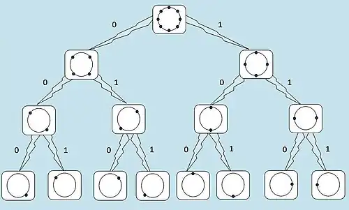 В качестве примера рассмотрим комбинированный кодер/модулятор, общая структура которого показана на рисунке. Бит b0 позволяет выбрать одно из двух созвездий, которые получились при первом разделении. Далее выбор определяется в зависимости от бит b1 и b2.