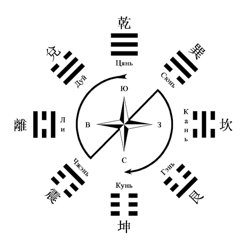 Расположение триграмм, приведенное в таблице ниже — это прежденебесное состояние (раннее небо).