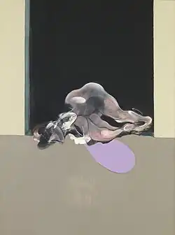 На центральной картине триптиха изображены двое мужчин, занимающихся сексом; по-видимому, Бэкон в этой части вспоминает свои встречи со своим потерянным любовником. Изображение основано на серии фотографий борцов Эдварда Мейбриджа, к которой он часто обращался в своём творчестве, но развивает их идею намного дальше, напрямую связывая акт любви с актами насилия[5]. Тем не менее картина выглядит довольно целомудренной: верхняя фигура изображена без гениталий[4]. По мнению искусствоведа Дениса Фарра их объятия не выглядят актом привязанности, а скорее больше напоминают «смертельный бой»[6]. Фоны внешних частей триптиха обрезаны снизу чёрными прямоугольными треугольниками, резко контрастирующие с низом фона центральной картины. Эта композиционная структура, возможно, была заимствована из «Купальщиков у реки» Анри Матисса, в которой также используются геометрические формы, чтобы отделить три фигуры и создать широкие пространства[3]. Как и во всех «Чёрных триптихах» в этой работе доминируют дверные проёмы, создающие угрожающее и зловещее присутствие, символизирующее смерть и пустоту, через которую субъекту предстоит пройти[6]. Именно дверные проём испускают тьму, представленную чёрной краской, которая давит и буквально поглощает изображение Дайера, удаляя большие части его плоти. В левой картине он потерял большую часть своего туловища, а в правой — часть плоти, проходящей от его талии до челюсти. Обе фигуры в центральной панели также разрушены и уменьшены. Искусствовед Виланд Шмидт утверждал, что если можно было бы продлить триптих во времени, то чёрный цвет «поглотил бы их полностью»[5]. Бэкон впервые использовал подобный мотив в своём «Распятии» 1965 года[7].