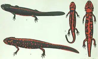 Один из наиболее крупных представителей данного рода — длина самцов около 12 см, самок — 16 см. Окраска спины — тёмная, вплоть до чёрной, с оранжевой линией вдоль позвоночника. Некоторые особи имели оранжевые пятна на спине и по бокам туловища. Окраска живота ярко-оранжевая с тёмными пятнами. Хвост самцов в брачный период приобретал тёмно-синюю окраску.