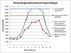 Во время сухого сезона с ноября по май мощность производства электроэнергии ГЭС ограничена объёмом потока реки, что видно на диаграммах справа. При наличии же достаточного потока, выходная мощность ограничена возможностями генераторов. Максимальные кривые мощности были рассчитаны на основе среднего расхода, при условии, что уровень воды составляет 175 м, а валовая эффективность энергоузла — 90,15 %. Фактическая мощность в 2008 году была получена на основе ежемесячной электроэнергии, отправленной в сеть[27][28].