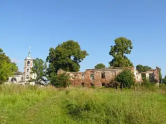 Центром поместья являлся большой усадебный дом (не сохранился), по бокам которого стояли флигеля и многочисленные службы: крепостной театр, школа верховой езды, конюшня, гостевой дом, дом для слуг, оранжерея, лечебница, дом управляющего. Перед главным домом располагался парадный двор, замыкавшийся изящными каменными воротами. Именно они — наиболее запоминающаяся часть из того, что сохранилось от ансамбля поместья. Существует версия, что они — работа известного русского архитектора В. И. Баженова. «Это небольшое по размерам сооружение подчеркнуто монументально. Высокую, красивых пропорций арку проезда фланкируют сдвоенные тосканские колонны большого ордера. Венчает сооружение антаблемент с белокаменными триглифами. Величественность центрального проема подчеркивают две небольшие симметричные калитки с прямоугольными проемами пеших проходов».