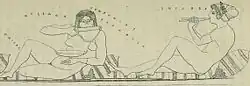 - Боковой левый рельеф (84×68×14,5 см) изображает обнажённую женщину (гетеру, «подругу»[9]), играющую на авлосе (двойной флейте). У неё необычная и, видимо, нереалистичная поза — нога на ногу.