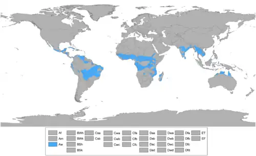 Aw климат распространен в обоих полушариях. В Евразии этот климат характерен для Филиппин, Вьетнама, Лаоса, Камбоджи, Таиланда, Мьянмы, восточных и южных частей Индии (штаты Тамилнад, Андхра-Прадеш, Орисса, юг Западной Бенгалии, для южной части Бангладеш, северной части Шри-Ланки, на западе острова Хайнань. Этот климат распространен также на полуостровах Кейп-Йорк и Арнемленд в Австралии, на острове Тимор и южном побережье острова Папуа-Новая Гвинея.