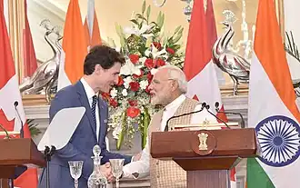 В области национальной обороны правительство Трюдо, как и предыдущие кабинеты, неоднократно откладывало обновление боевой техники, находящейся в распоряжении ВВС и ВМС страны[5]. В международных отношениях Канада, США и Мексика подписали новое соглашение о свободной торговле, призванное заменить действующий договор НАФТА, пересмотра которого требовал президент США Дональд Трамп[10]. В 2017 году премьер-министр Канады выступил с критикой положения с правами человека в Мьянме[11] и на Филиппинах[12]. Значительное освещение в прессе получил визит семейства Трюдо в Индию в начале 2018 года, обернувшийся политическим скандалом: как выяснилось, среди людей, которых принял в ходе визита премьер-министр, был и активист сикхского сепаратистского движения, обвиняемый в связях с террористами. Активизм кабинета Трюдо в области продвижения в мире права женщин на аборт осложнил отношения Канады со странами с консервативными традициями, составляющими значительную часть так называемой Группы 77[13].