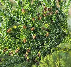 Хвоя кожистая, сверху тёмная, снизу белёсая, обладает приятным ароматом, который распространяется при растирании чешуек. Чешуйки хвои, располагающиеся в одной плоскости по 2—4 в ряд, срастаются между собой.