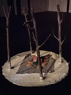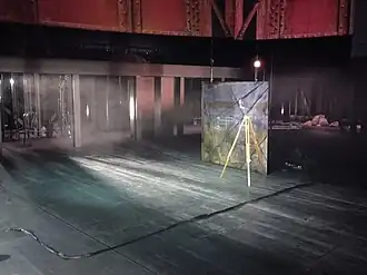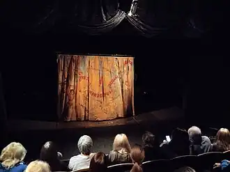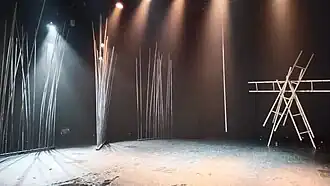 - «Деревня канатоходцев». Спектакль Театральной компании «Открытое пространство» (Санкт-Петербург). Он стал лауреатом премии «Золотая Маска» 2019 года в номинации «Лучшая работа художника»[43]. В основе спектакля лежит история о горном ауле, в котором невеста становится женой только после того, как пройдёт к возлюбленному по канату над глубоким ущельем. Декорации аскетичны: они выполнены из неструганных досок и камней, верёвок и канатов, грубых тканей и войлока, даже луну изображает кусок лаваша, «взмывающий вверх на тоненьком тросике». Финал спектакля оптимистичен — к балансирующей на канате куколке-девушке подбегает юноша и несёт её на плече[44].