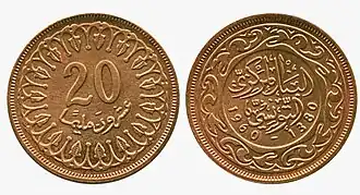 Аверс — «البنك المركزي التونسي», ниже — год чеканки; по кругу орнамент. Реверс — номинал «20/عشرون مليما»; по кругу орнамент. Гурт — рифлёный