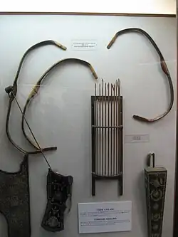 Лук носился в налучье, стрелы — 20—30 штук — в колчане, весь комплект — саадак.