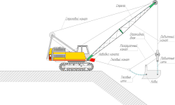 Подъёмным канатом осуществляется вертикальное перемещение (подъём ковша). Тяговым канатом осуществляется подтягивания ковша к машине. При этом происходит подрезка грунта и наполнение ковша.