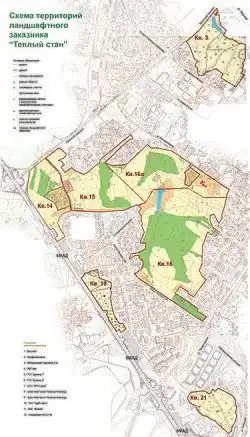 - ↑ О проекте планировки особо охраняемой природной территории "Ландшафтный заказник "Теплый Стан", Постановление Правительства Москвы от 24 декабря 2002 года №1034-ПП. docs.cntd.ru. Дата обращения: 16 января 2020. Архивировано 16 января 2020 года.