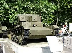 Т-26 — советский лёгкий танк. Самый многочисленный танк Красной армии и финской армии к началу Великой Отечественной войны, а также армии Испанской Республики времён гражданской войны в Испании, второй по количеству выпущенных после Т-34 советский танк 1930-х — 1940-х годов[4]. Создан на основе британского танка Vickers Mk E (также известного как «Виккерс 6-тонный»), закупленного в 1930 году. Принят на вооружение в СССР в 1931 году.