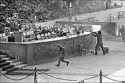 Ближе к концу парада, примерно в 11:40, артиллерийский грузовик, который двигался по площади в строю военной техники, внезапно затормозил. Находившийся в нём лейтенант Халед Ахмед аль-Исламбули в десантной форме спрыгнул с машины и метнул в сторону трибуны ручную гранату. Она взорвалась, не долетев до цели. Через несколько секунд ещё пятеро десантников спрыгнули с платформы грузовика и открыли автоматный огонь по правительственной трибуне[10]. Началась паника, Анвар Садат поднялся из кресла и произнёс: «Не может быть!» Встав неподвижно, Садат оказался мишенью для снайпера: пули пробили шею и грудь, задев лёгочную артерию. По другой версии, Садат принял происходящее за попытку подразделения выразить ему особую преданность, поскольку ранее на том же параде так поступили высадившиеся с воздуха прямо на плац парашютисты, и встал, чтобы отсалютовать в ответ[11]. Стрельба заняла около двух минут. Садат был доставлен в госпиталь, где и скончался почти через 2 часа.