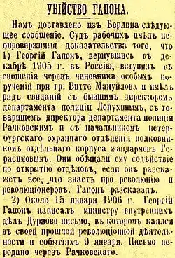 - ↑ Кто убийца Гапона? // Петербургская газета. — СПб., 1906. — № 202 (27 июля). — С. 2.