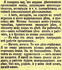 И. Ф. Манасевич-Мануйлов в своих воспоминаниях приводит одну из бесед с Гапоном, состоявшуюся в конце декабря 1905 года[84]. Гапон говорил о своей поддержке Манифеста 17 октября, неприятии насильственной тактики революционеров и стремлении ввести рабочее движение в мирное русло.