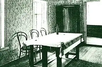 Комната, в которой произошло убийство, была выбрана чрезвычайно удачно. Маленькая, шириной в 4 и длиной в 5 аршин, с единственным окном, выходящим в сторону озера, она находилась на верхнем этаже дачи, куда вела узкая лестница с первого этажа. Сама дача находилась в стороне от других строений, поэтому крик о помощи едва ли был бы кем-то услышан. Труп Гапона висел направо от входа, верёвка была прикручена к железному крюку вешалки и многократно обмотана вокруг него. Труп находился в полусидячем положении, ноги убитого свободно лежали на полу, руки были заложены назад и сохранили следы от верёвки, которой были связаны[40]. Вид покойного производил тяжёлое впечатление. Лицо потемнело, стало коричневым и напоминало восковую фигуру. На лице были видны следы жестокой борьбы: левый глаз убитого вытек, нос был перебит и искривлён[37]. На лице сохранились ссадины от ударов, а на руке след от укуса[40]. На полу лежал разбитый стакан. Покойный был одет в тёмно-синий пиджак, под которым виднелись жилет, малороссийская рубаха и коричневая фуфайка; у ног лежала сброшенная шуба[37].