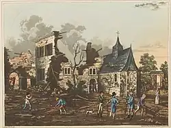 Южные ворота фермы и дом садовника (небольшая пристройка справа; была пристроена после 1815 года и разрушена в 2014 года во время реставрационных работ).