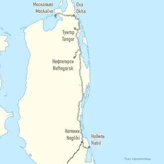 Протяжённость по состоянию на 2006 год — 233 километра (Промплощадка 5 км — Оха — Ноглики).
