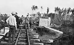 Места были непроходимыми, кругом ходили дикие звери. Дороги не было, приходилось вырубать деревья, бросать их в воду, на деревья класть узкоколейные рельсы, засыпать их землею. И по этому рельсовому пути продвигалась вагонетка с лошадью, поддерживающая сообщение с местом постройки. К началу мая была построена большая гостиница, в которой размещались все служащие. Одновременно начаты были работы по постройке станции и на болоте.