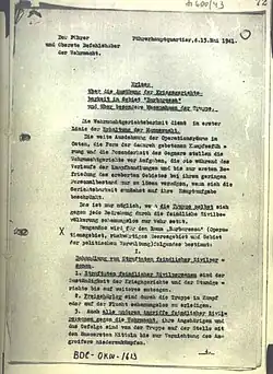- ↑ Указ Верховного главнокомандующего вермахта о военной подсудности в районе «Барбаросса» и об особых полномочиях войск | Преступления нацистов и их пособников против мирного населения СССР в годы Великой Отечественной войны 1941–1945 гг. victims.rusarchives.ru. Дата обращения: 4 июня 2021. Архивировано 4 июня 2021 года.