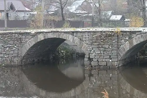 Мост имеет три массивных цилиндрических свода, которые опираются на два быка и береговые устои. Контрфорсы, выложенные из гранитного плитняка, укрепляют конструкцию и обогащают композицию моста. Облицовочным камнем выложена арка свода, а сам мост выложен из бутового камня. Ограждения были утрачены[1].