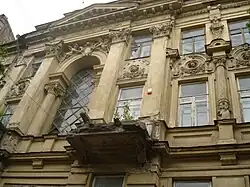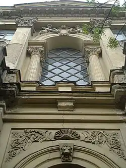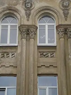 Между окнами первого этажа изображены лопасти с ленточной рустикой, оживляющей плоскость стены игрой светотени и создающей впечатление массивности здания. Верхний пролёт занимает третий и четвёртый этажи. Межоконные проёмы выделяют спаренные полуколонны с капителями, украшенными виноградным орнаментом. В округлых нишах между арочными окнами поочередно повторяются скульптурные головы мужчины и женщины. Окна на выступах в стене, более тесно сгруппированные и обрамленные общим бордюром, подчеркнуты пилястрами. Над арочными окнами четвёртого этажа размещены характерные для неоготического стиля розетки. Ступенчатые парапеты выступов украшены полукруглыми нишами, картушами, поставленными под углом башенками с зубчиками. Среднюю изогнутую часть фасада завершает парапет с прямоугольными нишами и зубчиками (сохранились не полностью).