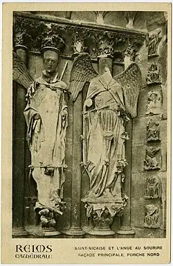 Фасады Реймсского собора чрезвычайно богато украшены статуями: в общей сложности их насчитывается 2303[1][2]. Особое место среди них занимают ангелы, из которых наиболее известен так называемый «улыбающийся ангел». Он расположен в северном портале западного фасада и был создан, вероятно, между 1236 и 1245 годом[3].