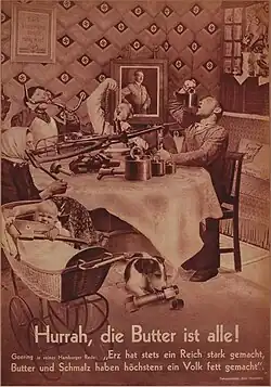 На действия нацистской верхушки откликнулся немецкий мастер политического фотомонтажа (фотоколлажа) коммунист и антифашист Джон Хартфилд. На его сатирической работе «Ура, закончилось масло!» изображены члены лояльной к режиму немецкой семьи, сидящие за столом комнаты со свастикой, портретом Гитлера и диванной подушкой с изображением Пауля фон Гинденбурга, вынужденные вместо продуктов употреблять промышленные железные изделия. В детализированной монтажной фотографии даже младенец в коляске вонзил зубы в топор палача со свастикой, а их лежащий на полу пёс вместо кости грызёт крупный металлический болт[7]. Несмотря на сатирический характер изображения, в поднятой Хартфилдом теме присутствует характерное для его творчества сожаление о том, что война делает бедными тех, кто от неё больше всего страдает — простых обывателей, а не промышленников, наживающихся на военных заказах. Коллаж, как это обычно для его работ, сопровождается пояснительной надписью «Ура, закончилось масло!» («Hurrah, die Butter ist alle!»). Кроме того, внизу приведена цитата Геринга о масле: «Erz hat stets ein Reich stark gemacht, Butter und Schmalz haben höchstens ein Volk fett gemacht»[8].