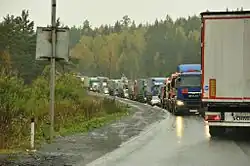 Проезд по шоссе осложняется небольшой шириной дороги и тем, что оно практически не имеет многоуровневых пересечений с крупными трассами (за исключением нескольких развязок с М5). Так, протяжённые заторы возникают на пересечениях со Смирновской улицей, Островецким шоссе и так далее.