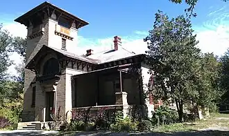 На фото изображён проходной архитектурный ансамбль, который на самом деле предназначен для парогенераторной установки, обеспечивающей всю усадьбу электричеством.[4]