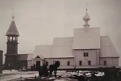 | Рисунок 1878 года (предположительно, неточен) | Церковь в 1905 году (после реконструкции) | Вид в 2001 году | Колокольня (до пожара) | Церковь в огне (18.11.2015) | Руины церкви (2017 год) |