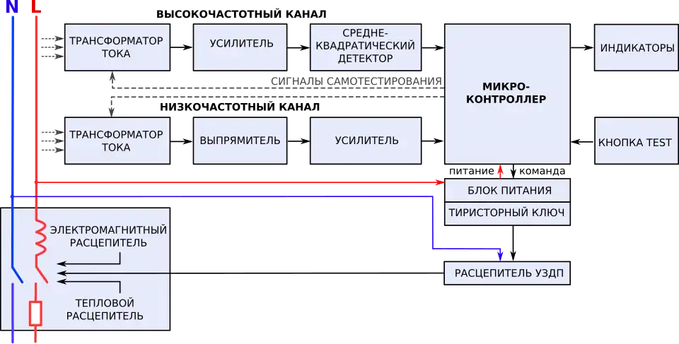 Блок обнаружения дугового пробоя отслеживает ток в фазном проводнике с помощью двух трансформаторов тока. Трансформатор низкочастотного канала считывает мгновенное значение тока сетевой частоты, которое выпрямляется диодным мостом (без использования сглаживающего фильтра) и усиливается нормирующим усилителем[24]. Трансформатор высокочастотного канала считывает сигнал в узкой полосе частот, лежащей в диапазоне от 5 до 50 МГЦ, исключая особо зашумлённую полосу 15—18 МГц[30][31]. На практике в устройствах ABB используется полоса частот в окрестности 10 МГц[27], в устройства Siemens полоса частот 22—24 МГц[32] (данные 2018 и 2012 годов). Узкополосный сигнал высокочастотного канала выпрямляется детектором среднеквадратического значения[24]. Встроенный микроконтроллер БОДП оцифровывает оба аналоговых сигнала и анализирует их средствами цифровой обработки сигналов. Микроконтроллер питается от маломощного импульсного блока питания, включённого между фазным проводником и нейтралью[24]; какие-либо иные соединения между ними в пределах УЗДП не допускаются[33].