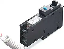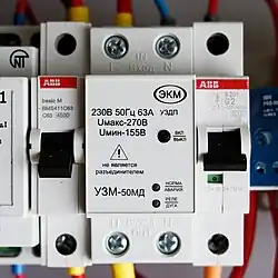 | Одномодульное УЗДП американского стандарта. Белая спираль — провод подключения к нейтрали | Одномодульный БОДП европейского стандарта, работающий в связке с внешним АВ или АВДТ | Двухмодульное УЗДП российского бренда, использующее вместо механического разъединителя электромагнитное реле[2] |