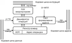 При выполнении программы УУ на входе получает очередную инструкцию или команду программы, которая поступает в регистр команд. Структурно регистр команд состоит из двух частей: в одной части хранится код операции (КОП), в другой части расположены адреса операндов, участвующих в управлении. Код операции поступает в дешифратор операции, который запускает последовательность смены состояний конечного автомата УУ, в современных машинах - запускает некоторую микропрограмму хранящуюся в ПЗУ микропрограмм. Суть работы УУ заключается в последовательном выставлении комбинаций сигналов управления на линиях управления.