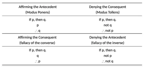 Из возможных форм «смешанных гипотетических силлогизмов», две являются корректными, а две некорректными. Утверждение антецедента (modus ponens) и отрицание консеквента (modus tollens) являются корректными.