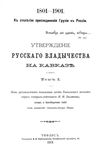 | Гражданское управление Закавказьем от присоединения Грузии до наместничества Великого князя Михаила Николаевича | 1901 | Тип. Канцелярии Главноначальствующего гражданской частью на Кавказе | 524 |