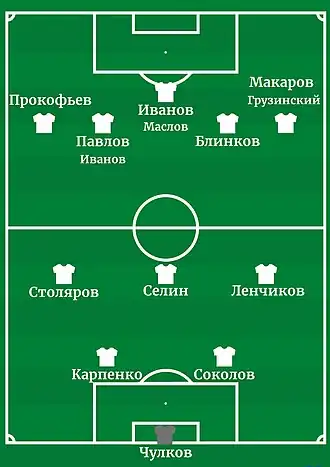 | «Динамо» Москва: Чулков - М.Соколов, Карпенко - Ленчиков, Селин КОР: К.Петров - Хрусталёв, Ф.Фёдоров - Артёмов, Аронов |