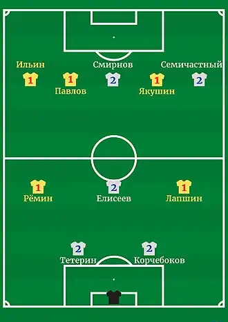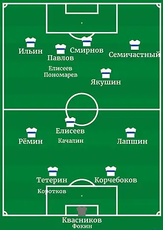 | «Динамо» Москва: Фокин - Тетерин, Корчебоков - Лапшин, Елисеев, Дубинин - Семичастный (46' А.Пономарёв), Якушин, Смирнов, Павлов, Ильин |