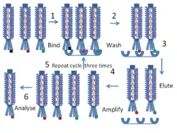 - Связавшиеся фаги могут быть элюированы (отмыты) и использованы для получения новых фагов путём заражения подходящих бактерий-носителей. Новая популяция фагов представляет собой смесь, в которой намного меньше нерелевантных (не связывающихся с целевыми молекулами) фагов, чем в изначальной смеси.