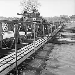 В сентябре 1939 г. 1-й файфский и форфарский йоменский полк высадился во Франции в качестве разведывательного полка 51-й (хайлендской) пехотной дивизии Британских экспедиционных сил, затем участвовала в эвакуации из Дюнкерка в июне 1940 г.[16] В дальнейшем полк служил в Великобритании в составе 28-й бронетанковой бригады 9-й бронетанковой дивизии[17] до августа 1944 г., когда он был переброшен в северо-западную Европу и участвовал в переправе через Рейн в составе 31-й бронетанковой бригады 79-й бронетанковой дивизии в марте 1945 г.[18]