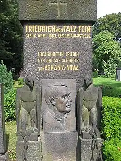 Фридрих Эдуардович Фальц-Фейн скончался 2 августа 1920 года в немецком санатории Бад-Киссинген и был похоронен на кладбище Двенадцати апостолов в Берлине. На могильном камне, украшенном изображениями двух степных орлов, высечена надпись: «Здесь покоится знаменитый создатель „Аскании-Нова“».