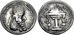 ![]() Бронзовая монета Фарн-Сасана. Он изображён на аверсе, а на реверсе изображён алтарь огня | |